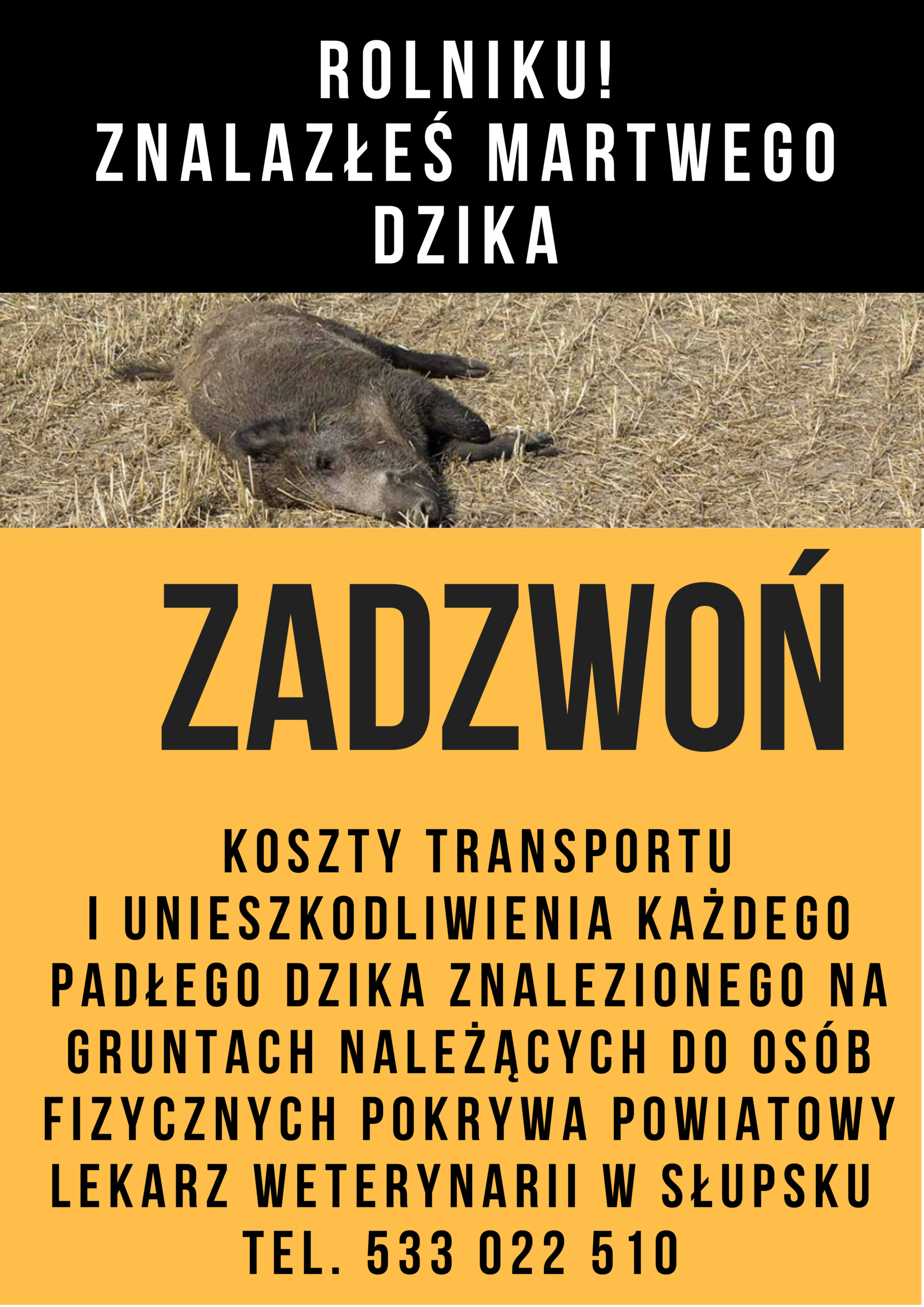 Powiatowy Lekarz Weterynarii w Słupsku apeluje o zgłaszanie każdego przypadku padłego dzika pod nr telefonu 533 022 510. Koszt transportu i utylizacji pokrywa Powiatowy Lekarz Weterynarii.